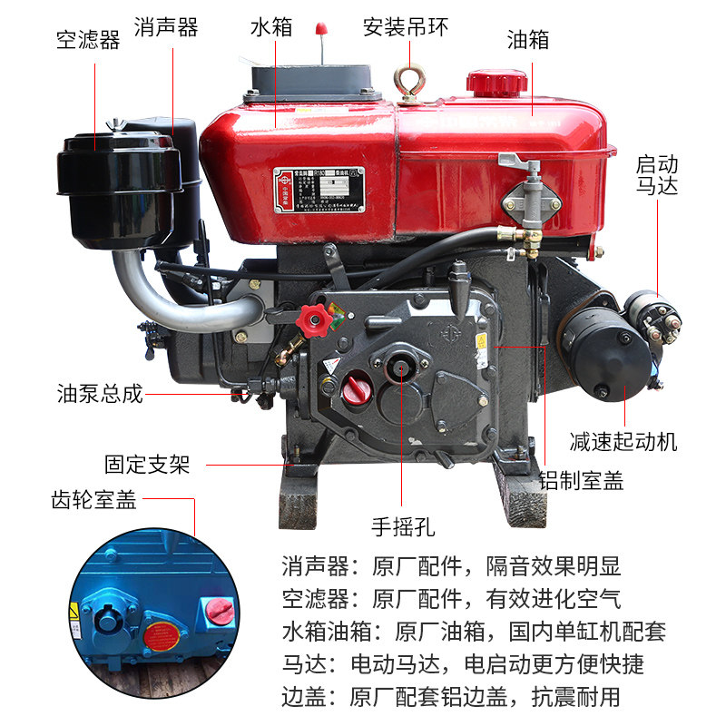 R175 hand-cranked-6 horsepower ZR175 hand-cranked direct injection-6 horsepower R180 hand-cranked-8 horsepower ZR180 hand-cranked-8 horsepower R180M electric-8 horsepower ZR180