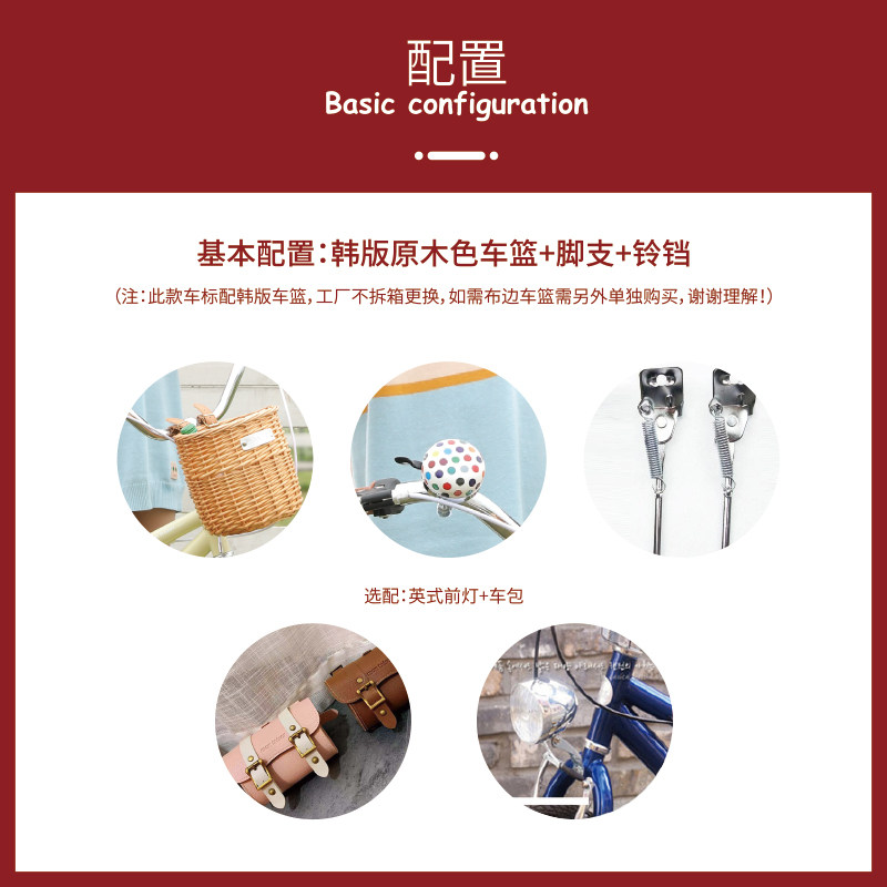 12 inches (send Korean version of the basket - color bell - auxiliary wheel - foot brace) 14 inches (send Korean version of the basket - color bell - auxiliary wheel - foot brace) 16 inches (send Korean version of the basket + color bell + auxiliary wheel + foot brace) 18 inches (send Korean version of the basket + color bell + auxiliary wheel + foot brace) 20 inch no auxiliary wheel (send Korean version of the basket + color bell + foot brace)