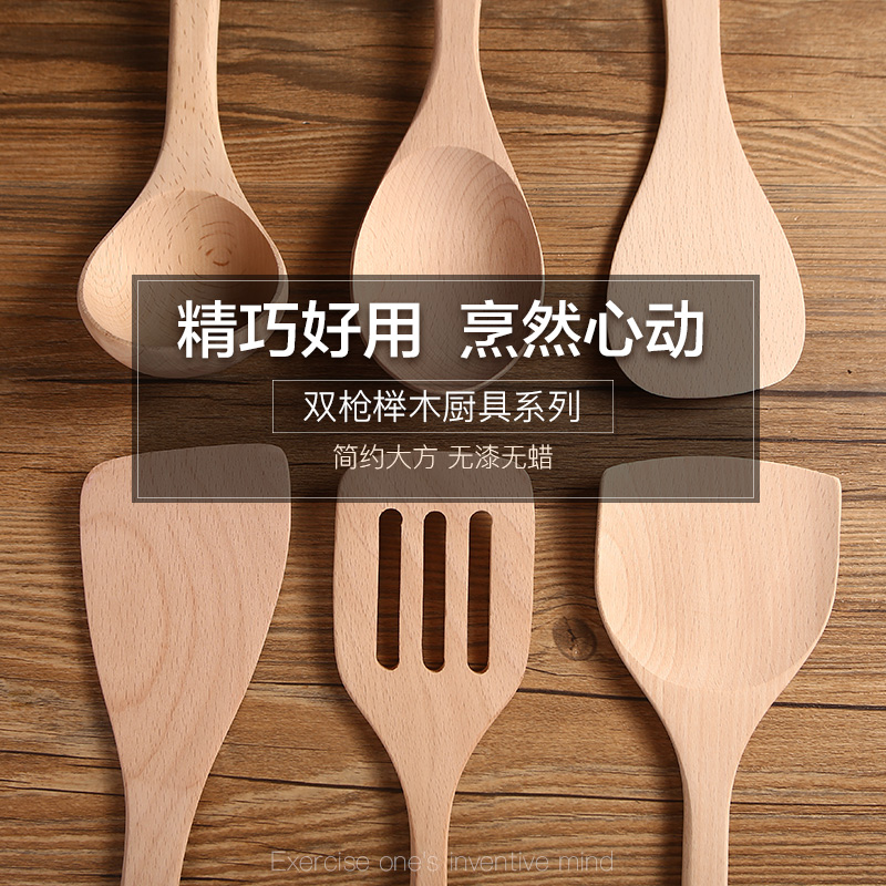 Double gun solid wood spatula Household spatula Soup spoon Rice spoon colander Frying spatula Special spatula Paint-free wooden spatula set