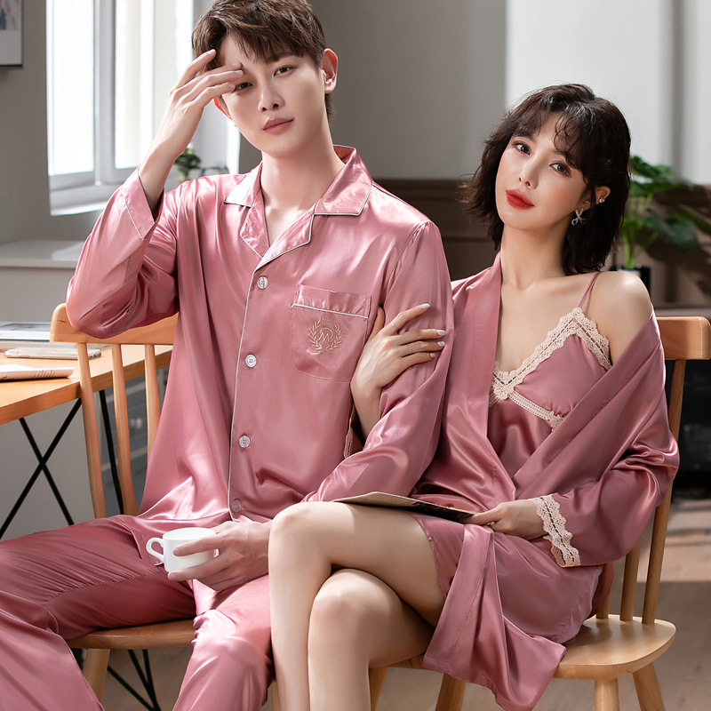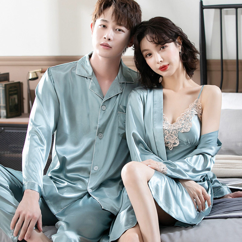 Couple pajamas spring and autumn ice silk sexy suspenders chest pad nightdress nightgown women's lace silk men's suit home service