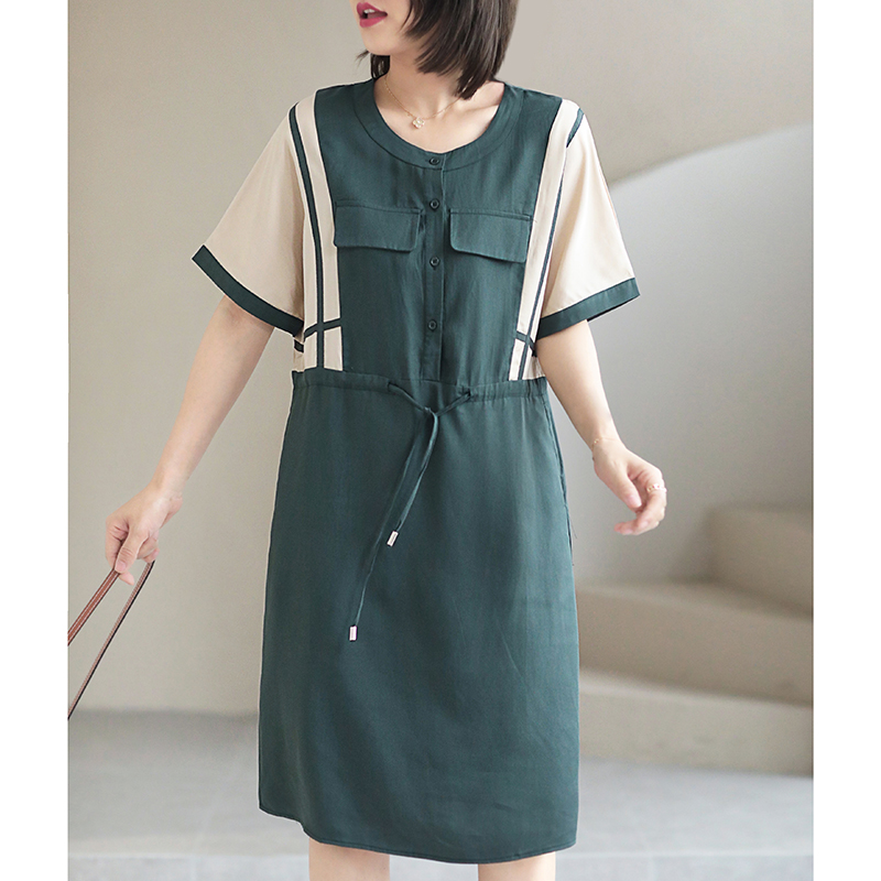 Xiao Says Design Sense Han Version Casual Heavy Pound Sky Silk Collision Color Round Collar Short Sleeve Ocean Dress Loose and Lean Summer