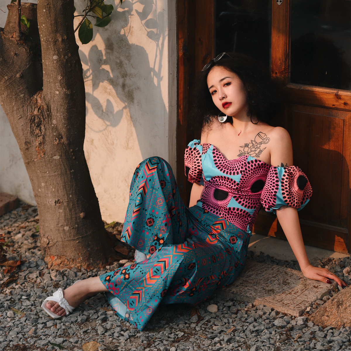 Cat's Travel Shop Bohemian Sea Islands Travel Bubble Sleeves Dew navel Clothing Printed on holiday Chest Blouse Summer
