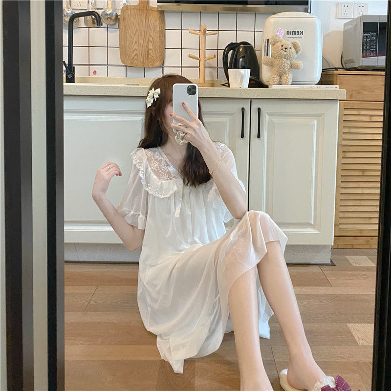 Princess Wind Cute Sleeping Dress Woman Summer 2022 Summer New Day Ensemble Sweet And Thin White Mesh Yarn Short Sleeve Pyjamas