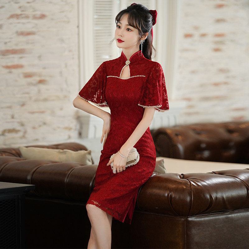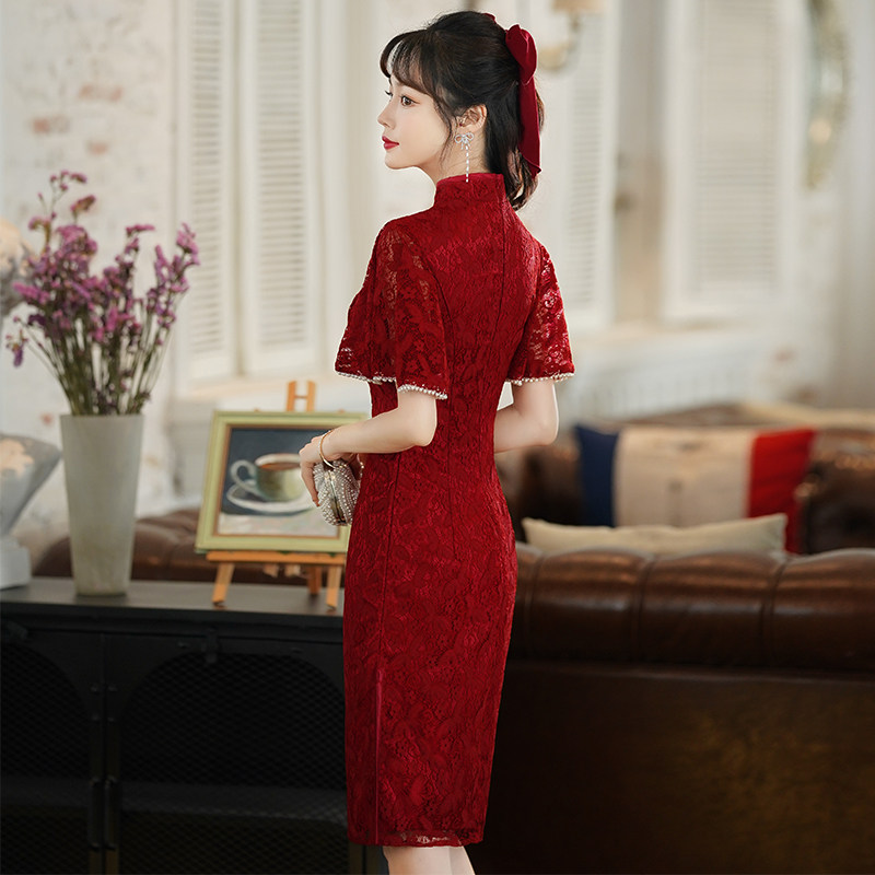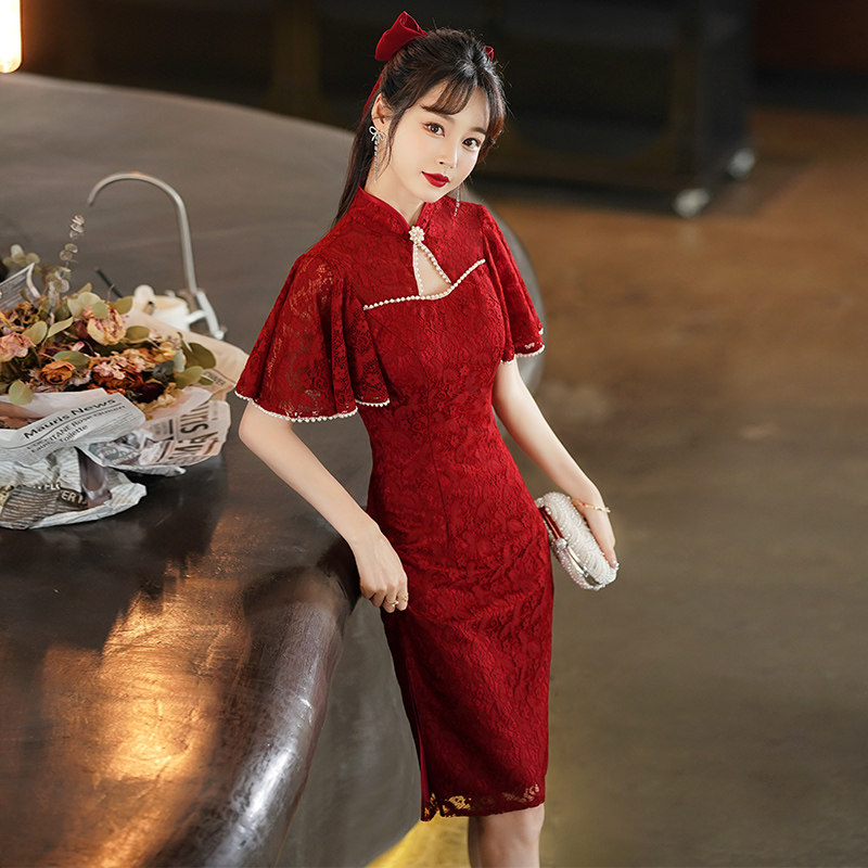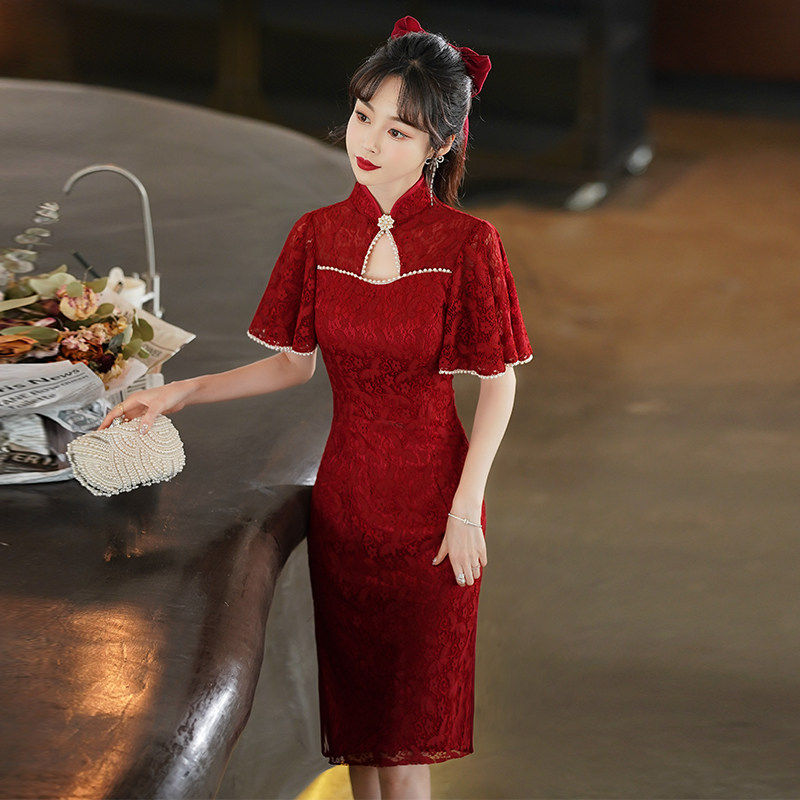 Qipao toast to the bride's wine red color 2022 The new summer wedding gown is usually available for a short lady