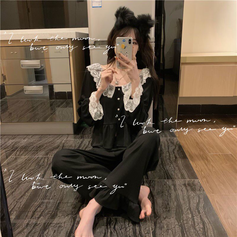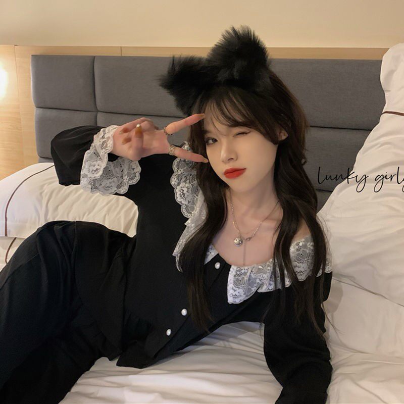 Sweet and cute Aging Doll Collar Sleepwear Pants Sets Schoolgirl Lace Splicing Temperament Long Sleeve Home Clothing Two Sets