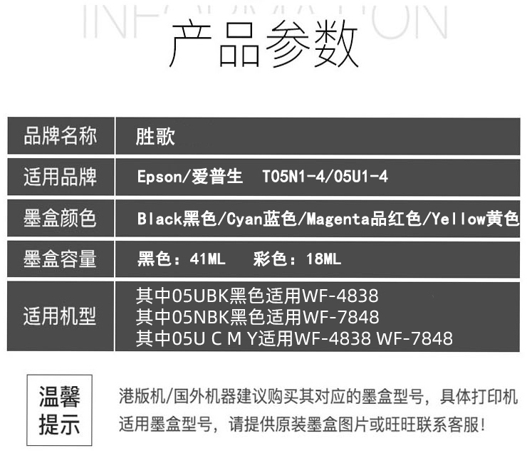 05N BK Black (fit WF-7848 7318) 05U BK black (fit WF-4838) 05U C blue (WF4838 7848 7318) 05U M red (WF4838 7848 7318) 05U Y yellow (WF4838 7848 7318) T6716 maintenance box (suitable for WF-4838) C9345 maintenance box (suitable for WF-7848) WF-4838 cartridge set of four (05U) WF-7848 cartridge set of four (05N+05U) WF-7318 cartridge set of four (05N+05U)