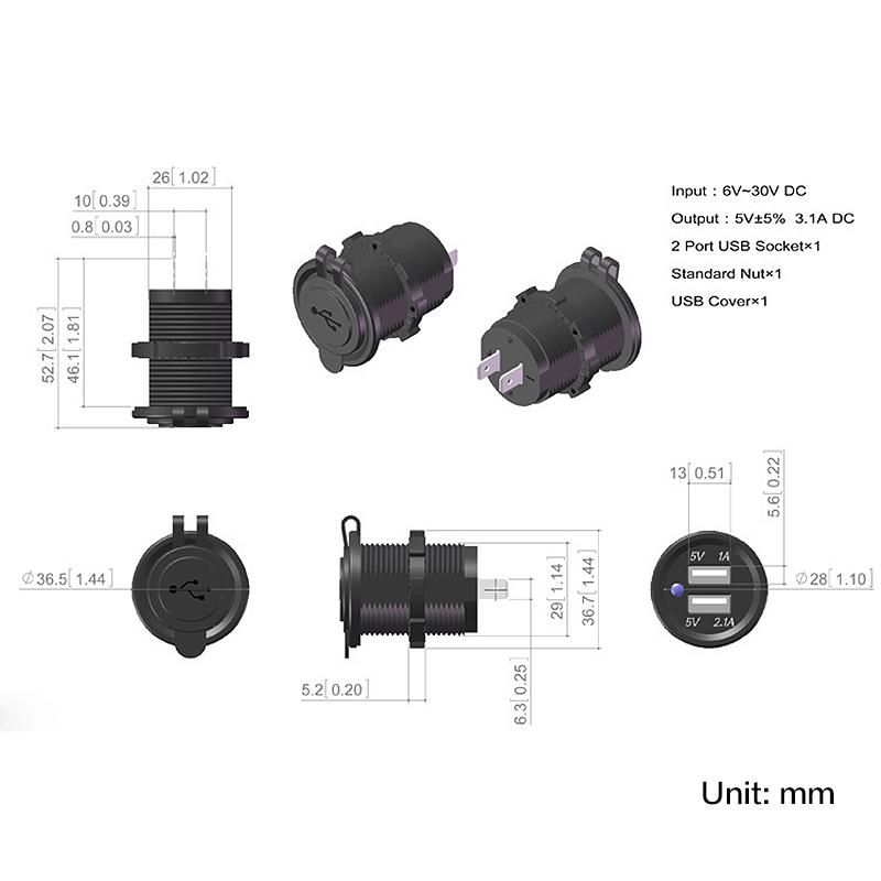 12V-90V wide voltage engineering vehicle battery car motorcycle modification dedicated dual USB port 2 1 power interface