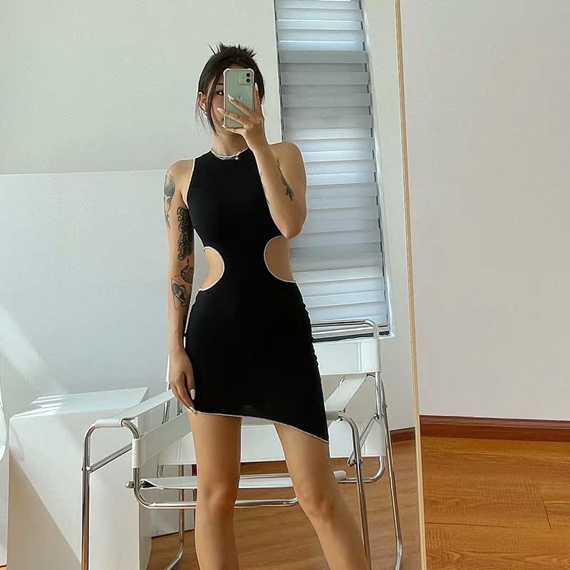 Black sexy hot girl tight hips irregular thread hollow waist slim dress small summer