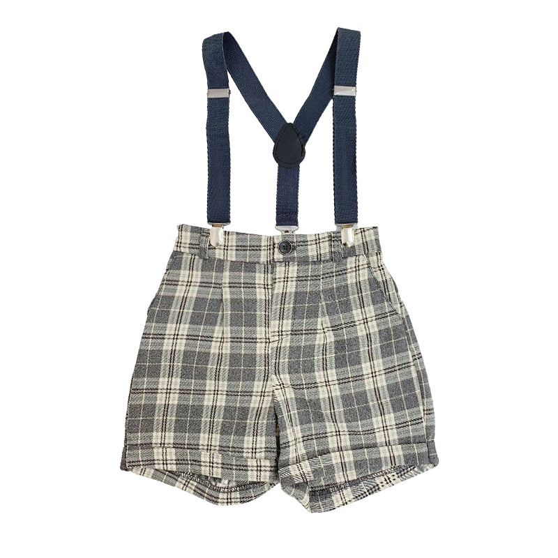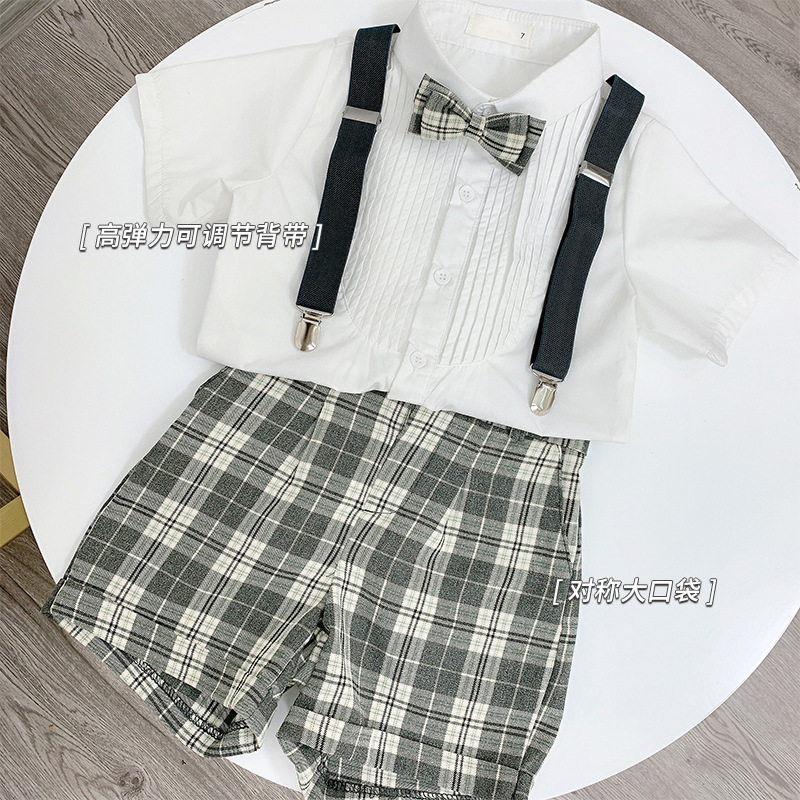 Plaid Shorts Shirt Hugging Baby Bag Bow Tie White Short Sleeve Shirt