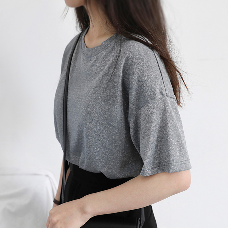 2021 spring retro ancient shiny round collar display slim short sleeve T-shirt temperament 100 lap elastic pure color blouses woman