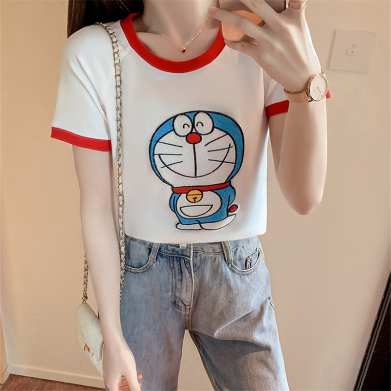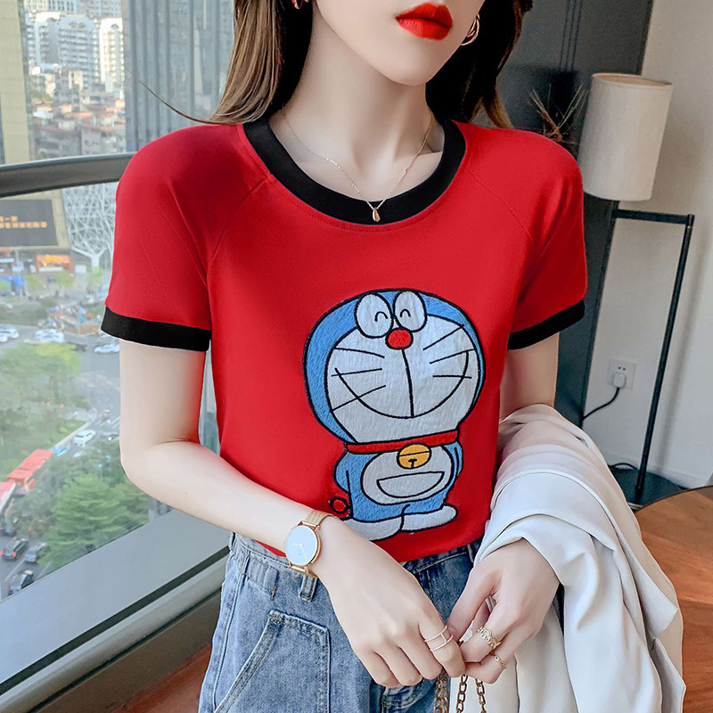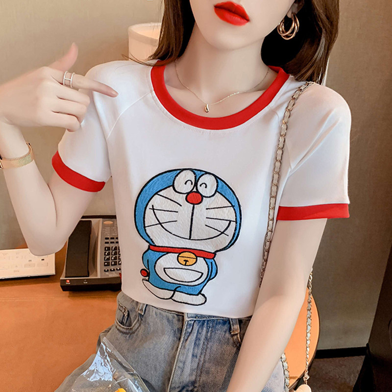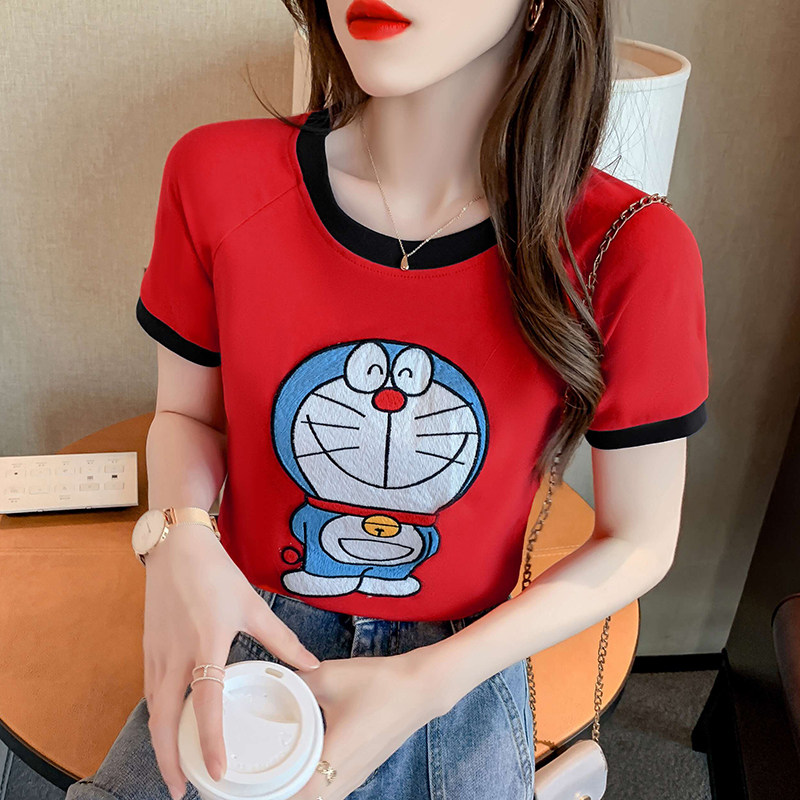 Doxa A dream T-shirt woman 2022 Summer new cartoon bites Cat Embroidery Short Sleeves Pure Cotton Loose s Tide Blouse