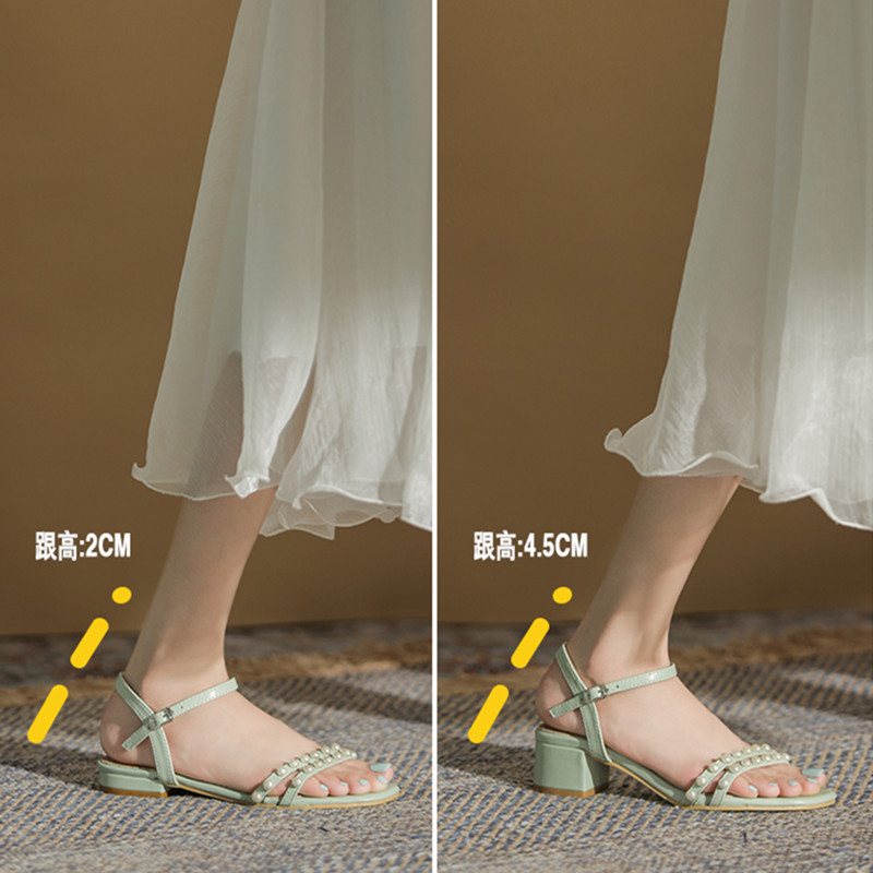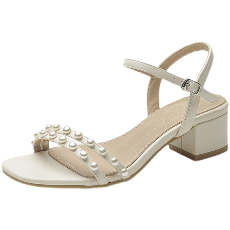 Pearl Beaded Chunky Heel Buckle Strap Combination Roman Style