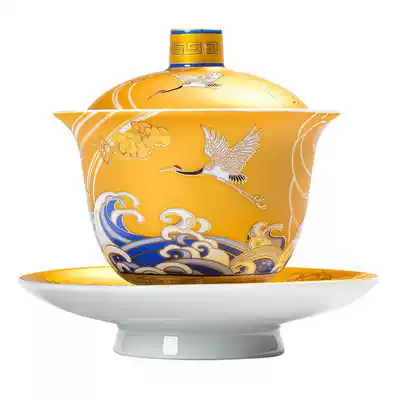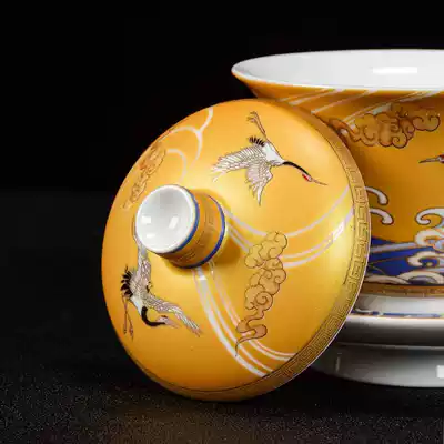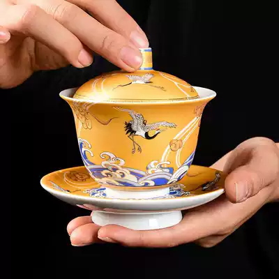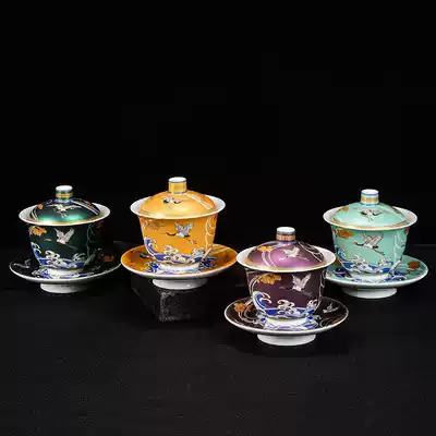 Enamel colored crane three-cai cover bowl to toast tea bowl Hand grab pot Teacup Single teacup Ceramic Gilt Crane tea bowl