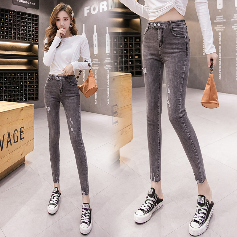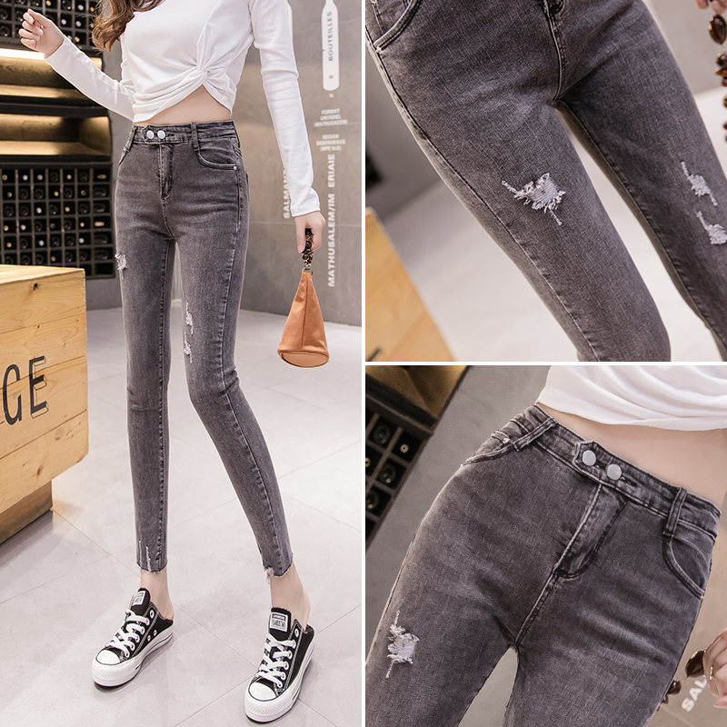 Jeans women's summer thin smoke gray 2021 New High waist tight slim high nine points broken pants