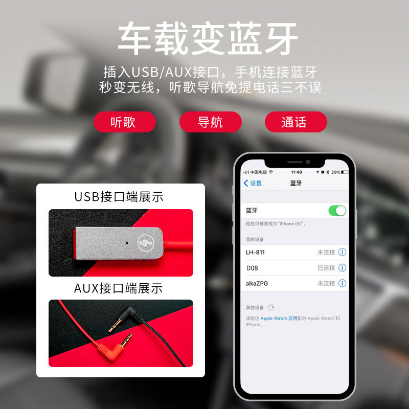 Car AUX to wireless mobile phone Music Navigation Handle-free call Bluetooth Connector 5 0