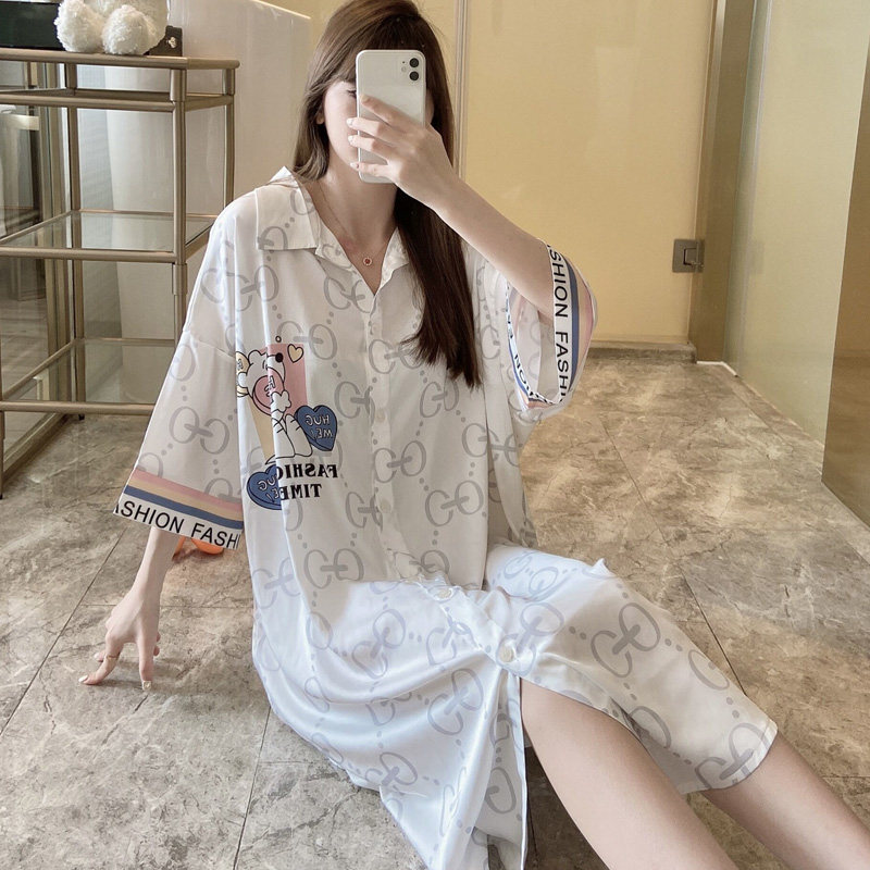 Nightdress Ladies Summer Ice Silk Thin Section 2022 New Cardigan Simulation Silk Summer Pajamas Skirt Homewear