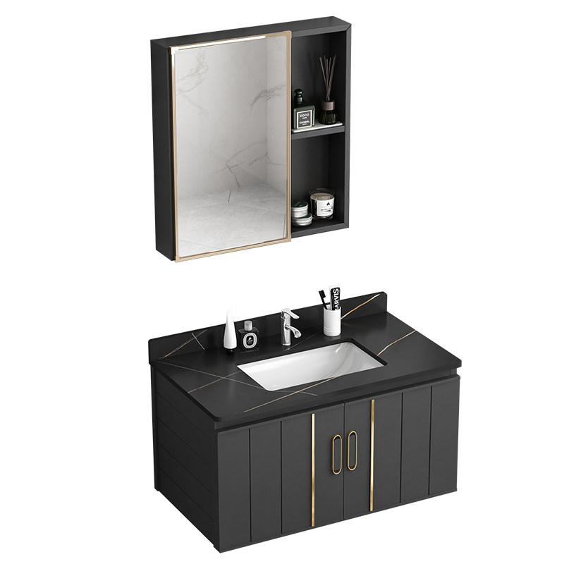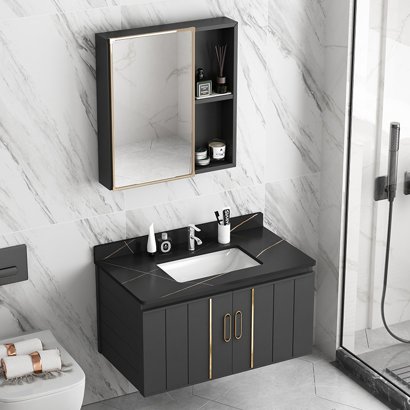 80cm black rock slab faucet set storage mirror cabinet