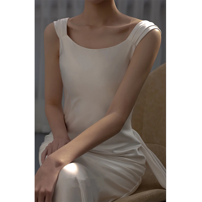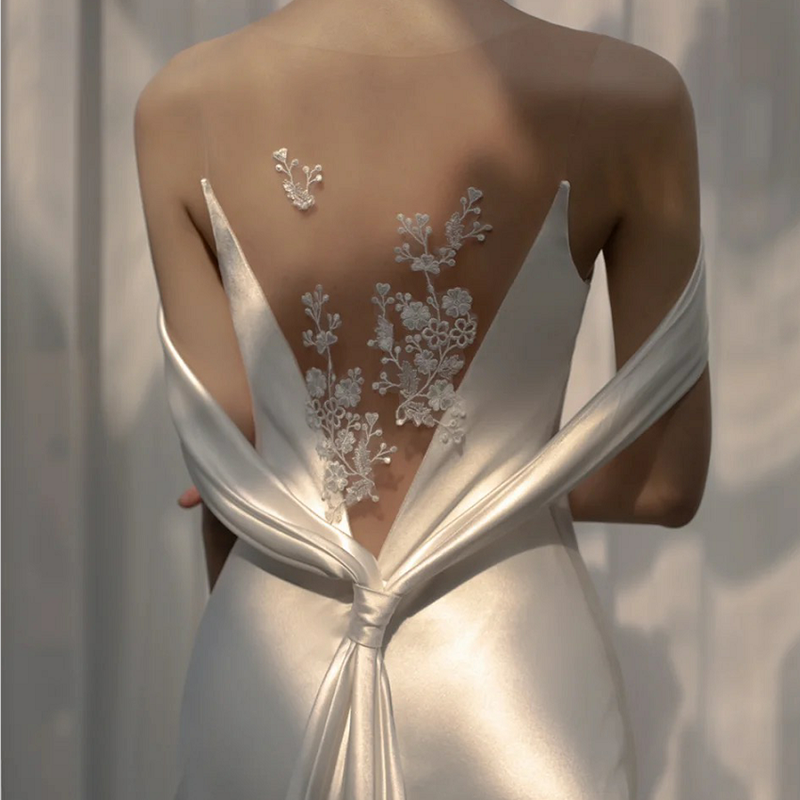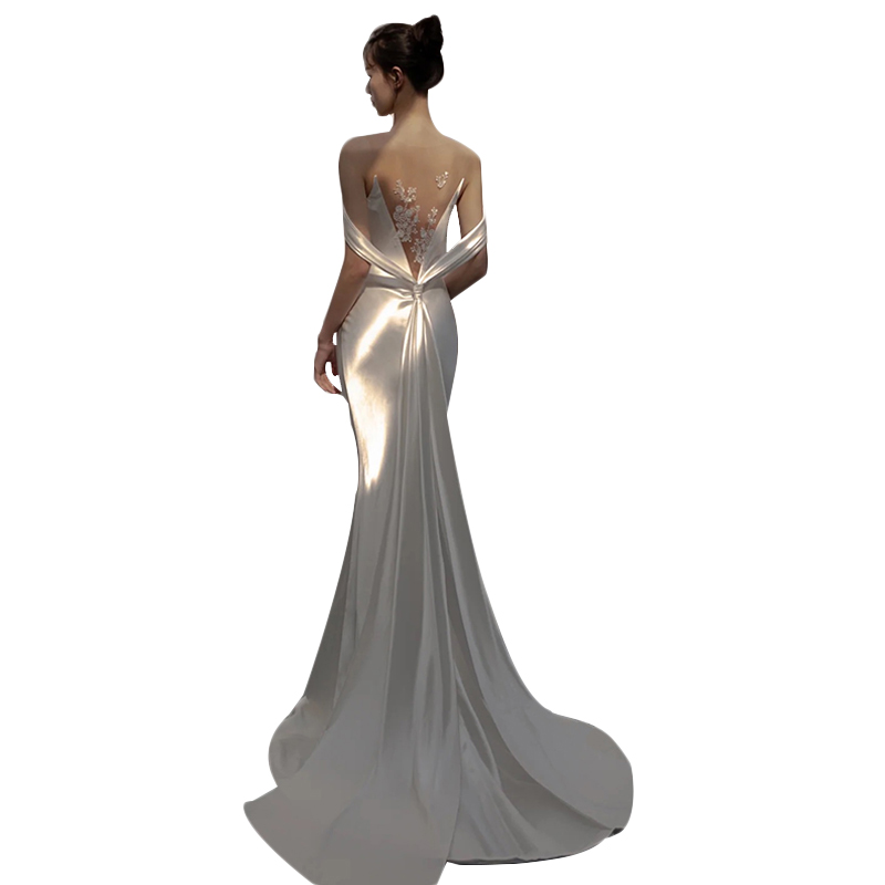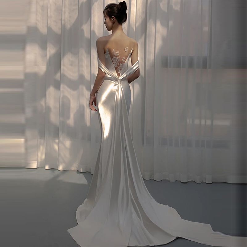 French wedding dress 2023 new bride bride simply dew the fish tail satin with shoulder to welcome the outdoor dress travel