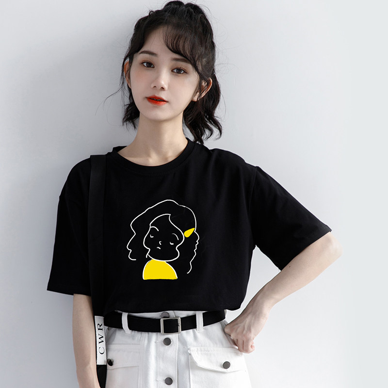 South Korea's 2022 summer new head print black short-sleeved T-shirt women's loose round neck basic t-shirt top