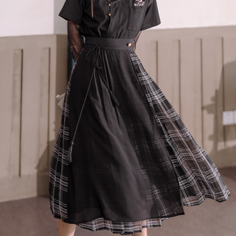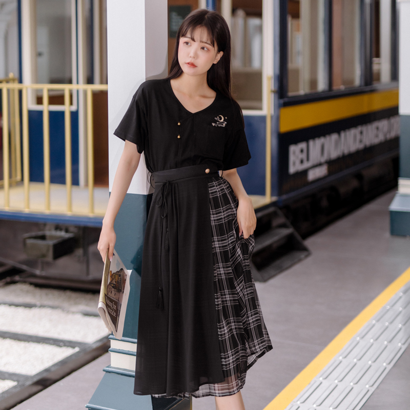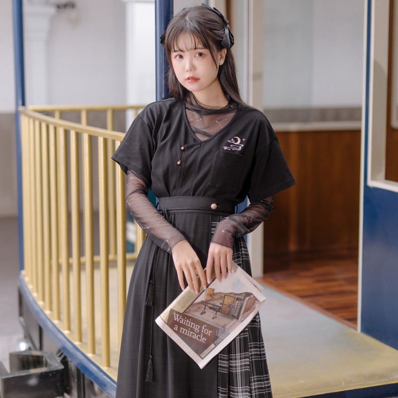 Chuan Dai Time: Starry Moon Xuan Night National Tide Wind Set Embroidered T-Shirt Summer Mesh Base Check Skirt