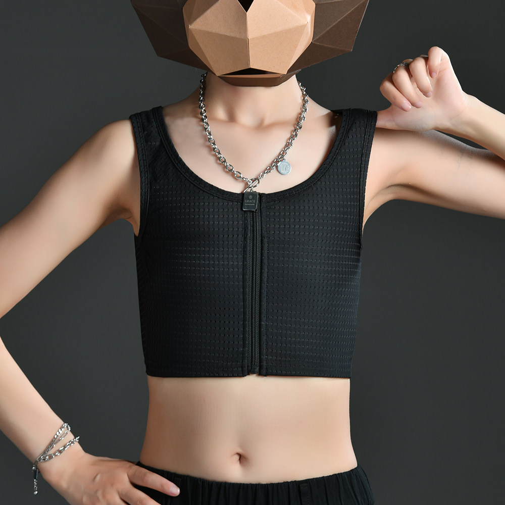 LES corset T ultra-flat chest vest summer breathable ice silk bursting breasts small sports zipper fat T large size female plastic chest cos