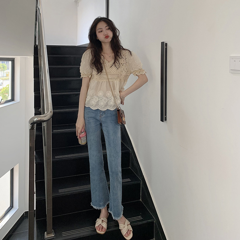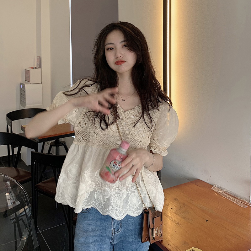 Collarless shirt women's summer 2022 new French design sense small bubble sleeve short-sleeved baby shirt chic top