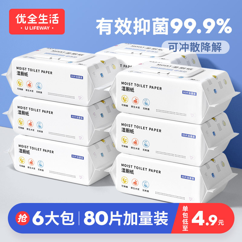 (6 packs)wet toilet paper 80 pumping family affordable pack men and women can flush into the toilet large pack ass wipe wet tissue