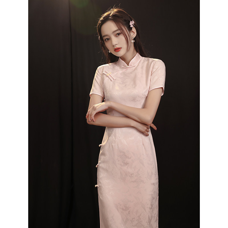 Bone erosion cheongsam improved version French pink young girl mid-length dress waist retro Chinese style summer