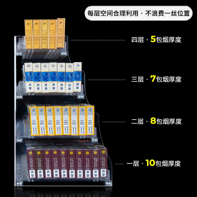 The height of the cigarette rack is the net height. The double-layer cigarette pusher has 2 layers and 10 rows (deep 29 high double-layer cigarette rack, 2 layers and 11 rows (deep 29 high double-layer cigarette rack), 2 layers and 12 rows (deep 29 high and three-layer pusher).