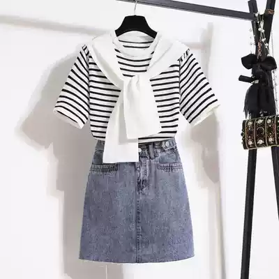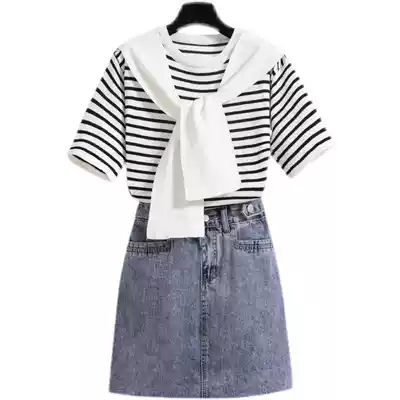 Shawl striped top skirt denim suit shawl striped top skirt denim Denim