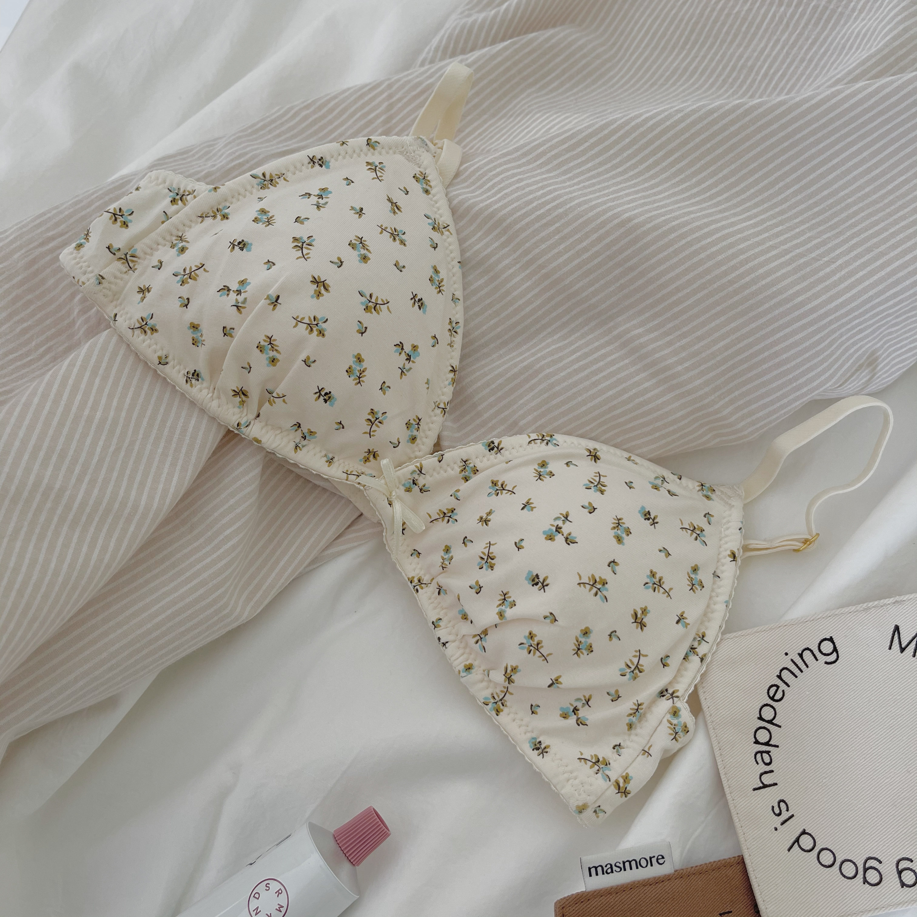 THREEPIG Fresh Small Floral Thin Comfortable No Steel Ring Triangle Cup Small Breast Beautiful Back Bra Underwear