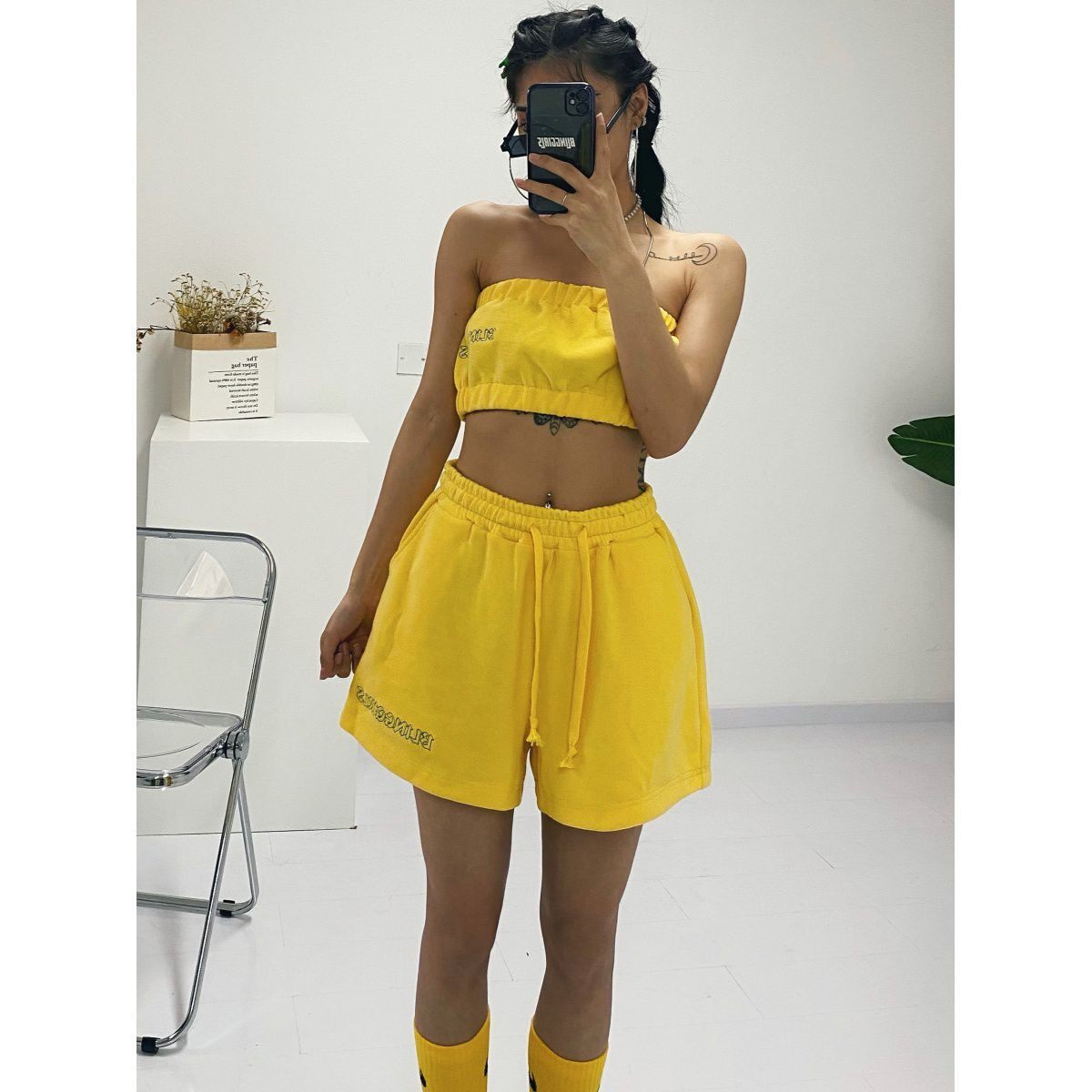 2022 Summer new Korean version Slim 100 Ride Sexy Hot Girl Dancing Sports Smear Shorts Two-piece Suit Female Tide