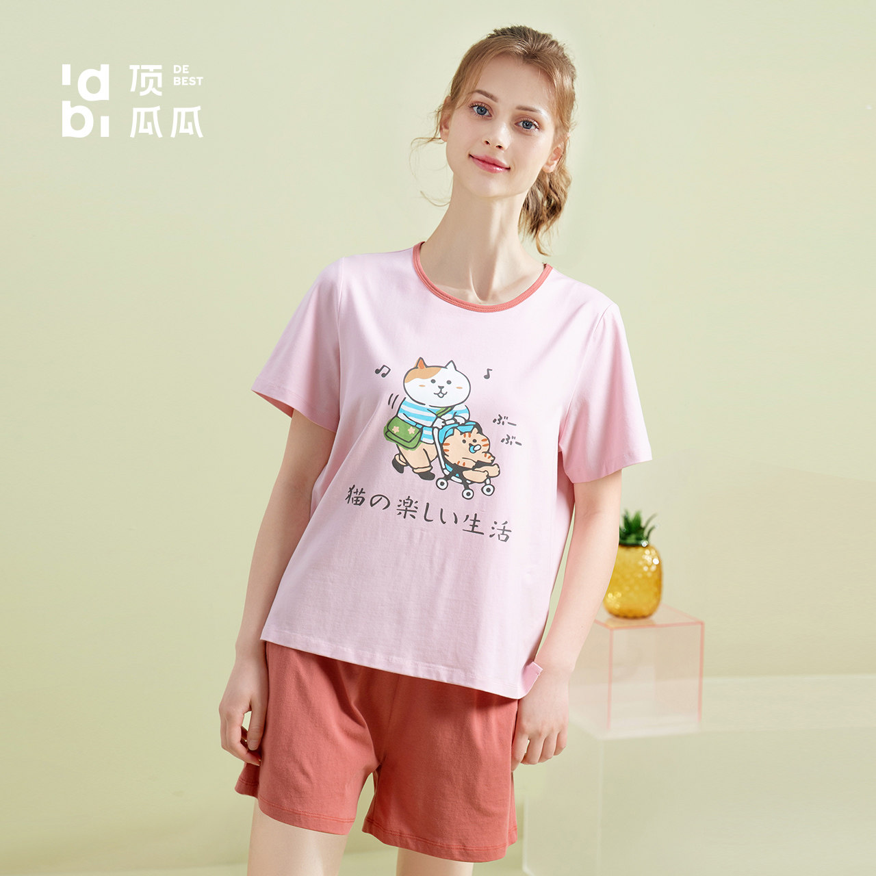 Top Melon Melon Summer Pure Cotton Short Sleeve Cute Printed Pyjamas Pants Cover Group Top Pip Women Full Cotton Comfort Round Collar Home Clothing