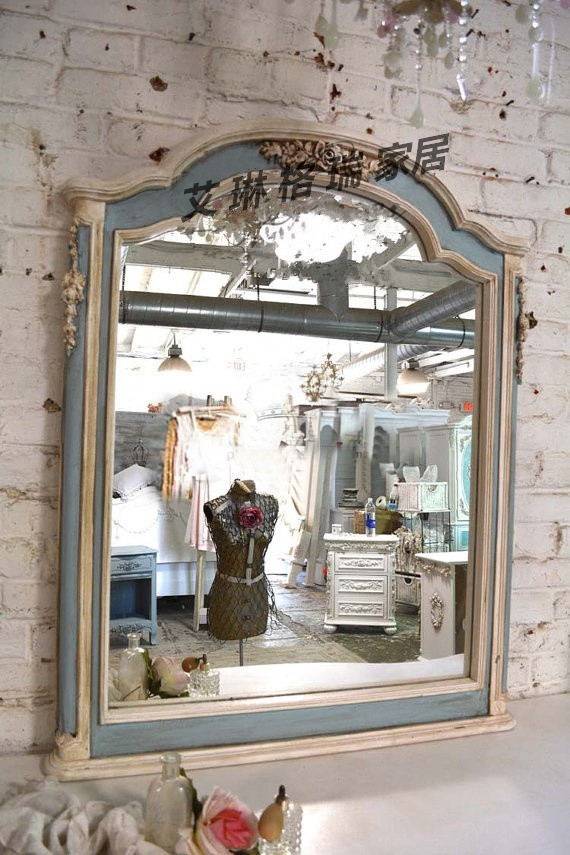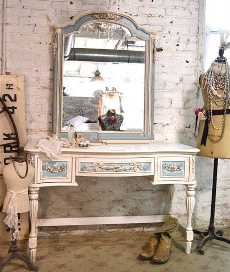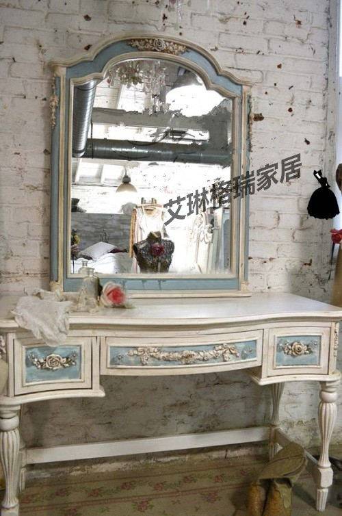 American countryside retro-washed blue made of old carved solid wood Makeup Bench Makeup Mirror Bedroom Makeup Table Antique Furniture