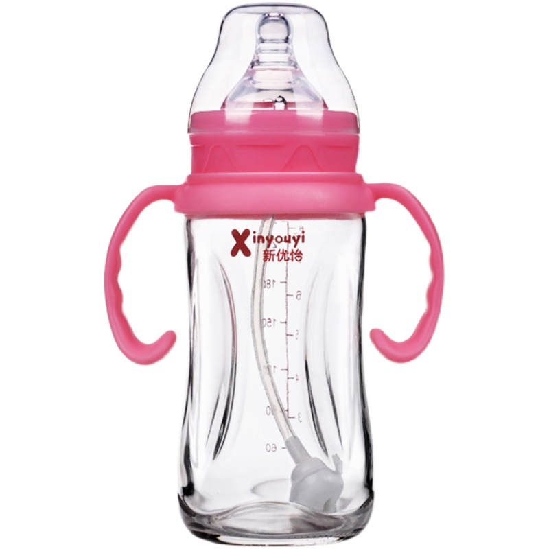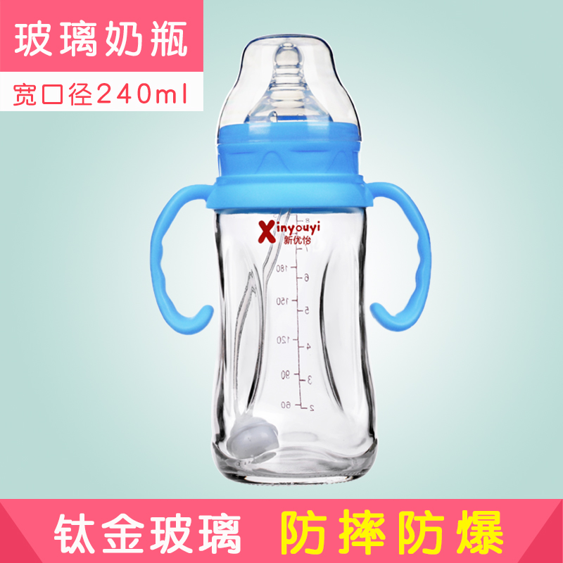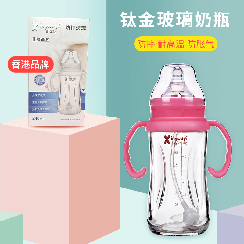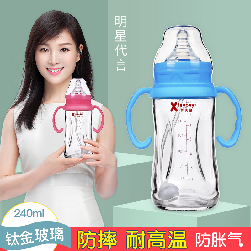 New Yu Glass bottle 0 - 1 - 2 years old baby large straw titanium alloy explosion resistant belt handle