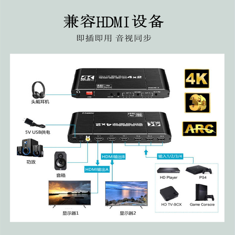 HDMI switcher 2 0 matrix four-in-two-out splitter 4X2 audio separation HD broken code HDCP splitter