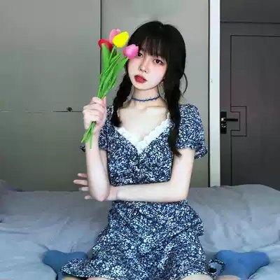 French V-neck lace waist dress Women summer 2021 New Korean version of temperament bubble sleeve floral skirt tide