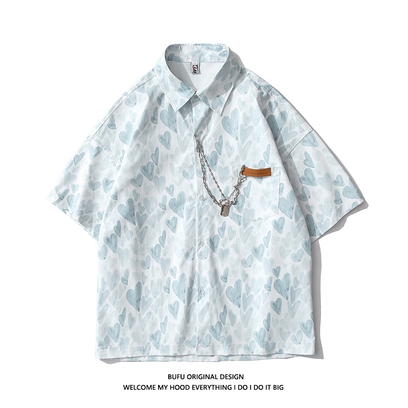Hundreds of millions of teenagers niche design sense chain love printed shirt men and women couple summer loose Hawaiian shirt