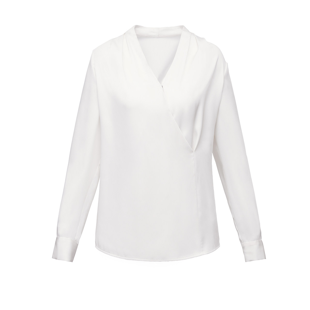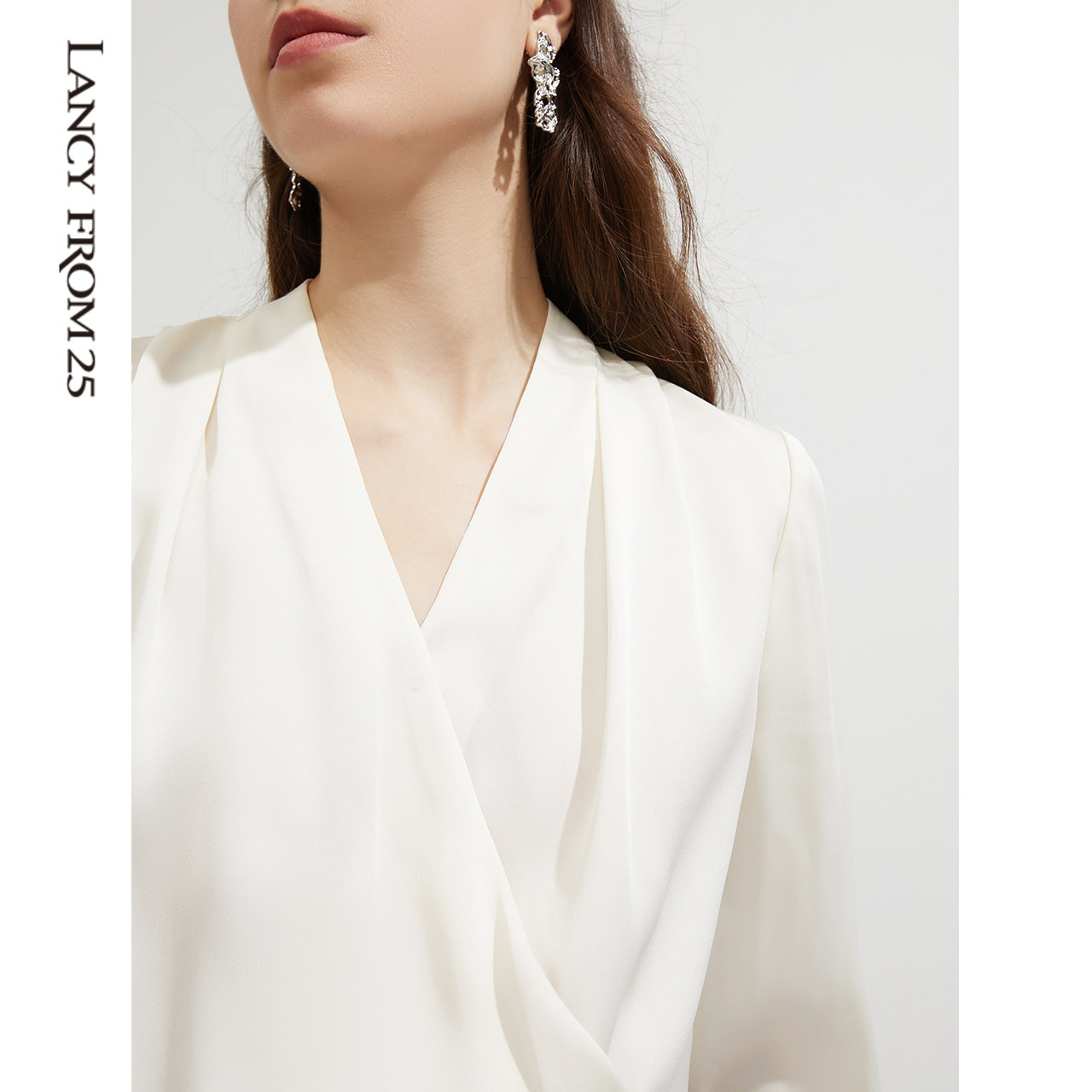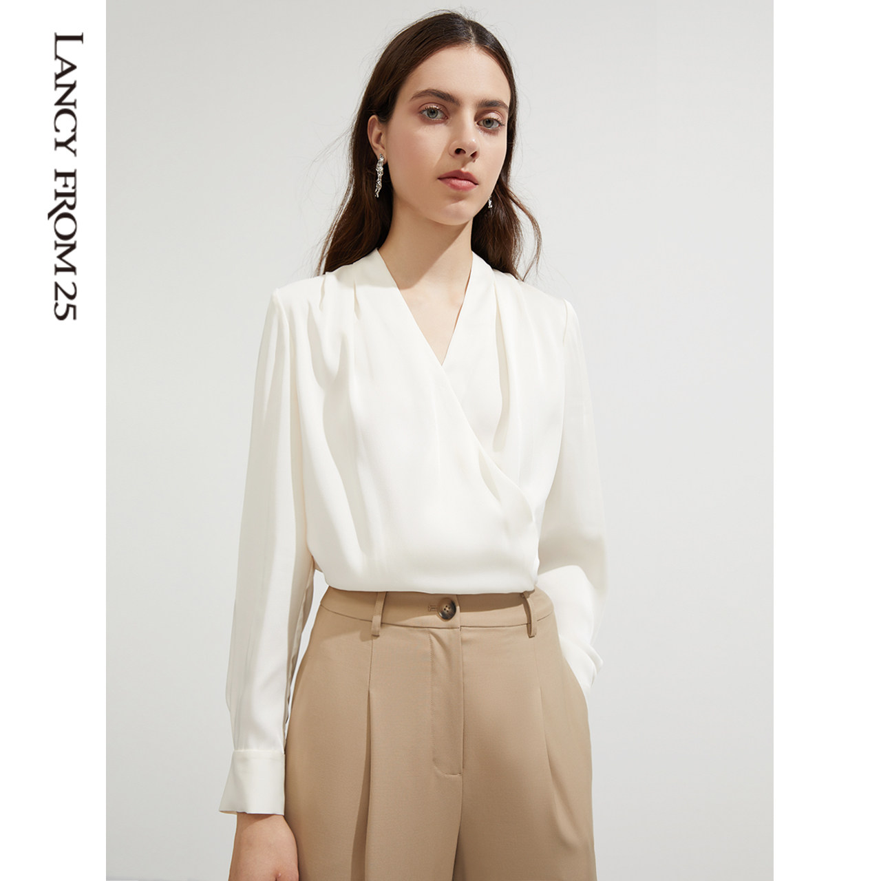 Lanpose Rice White V Collar Blouse Lady Spring Autumn New Style Temperament Long Sleeve Folds Shirt Shirt Advanced Feel