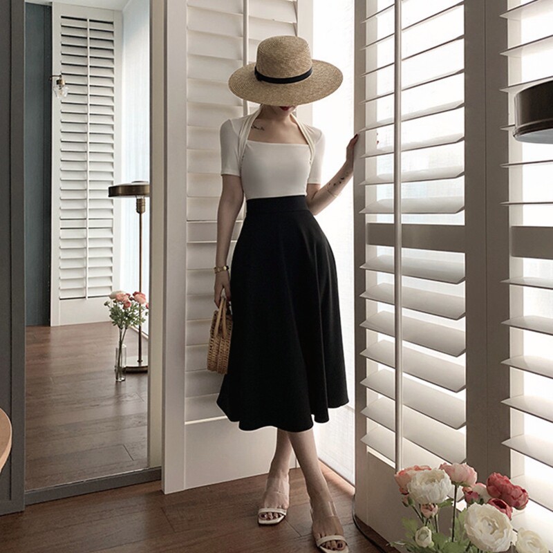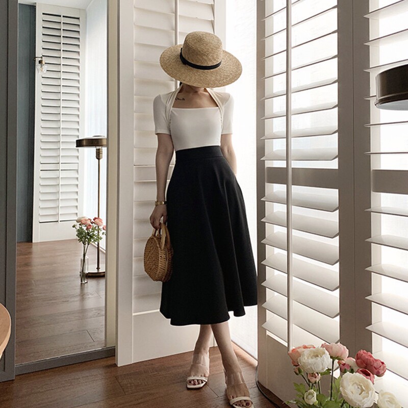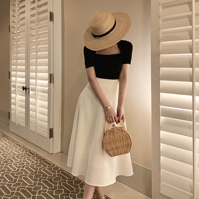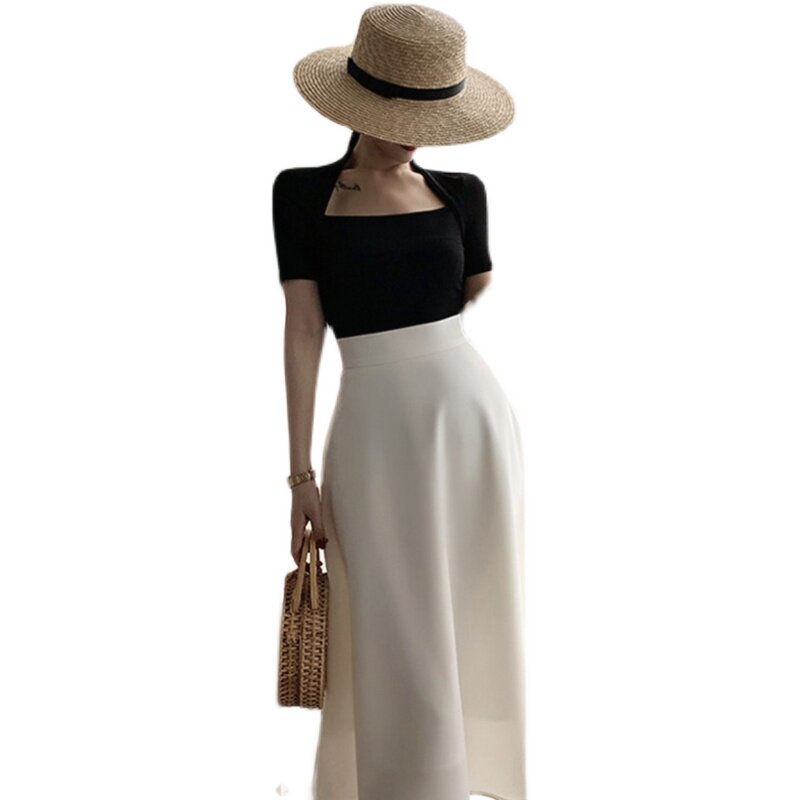 Sandro Moscoloni2022 new Hepburn Umbrella skirt half body dress Low collar Slim T-shirt Suit Women Summer