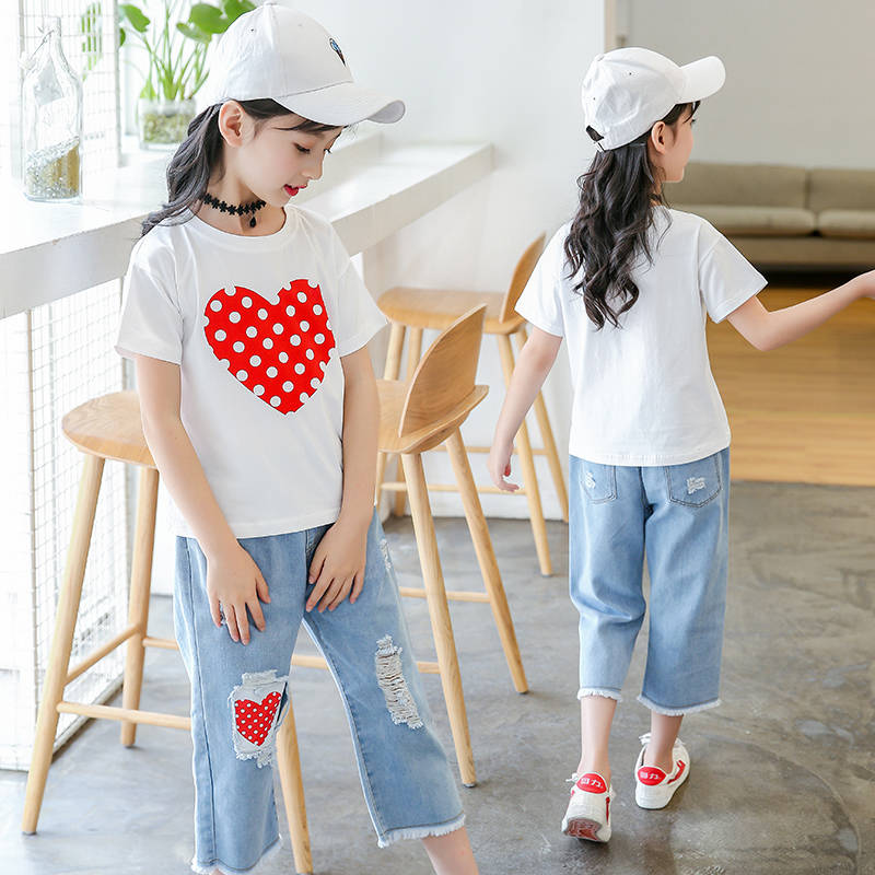 Girls Kit 2022 New Summer Yankee Han Edition Short Sleeve Jeans Children's Bottom Summer Two - Piece Set