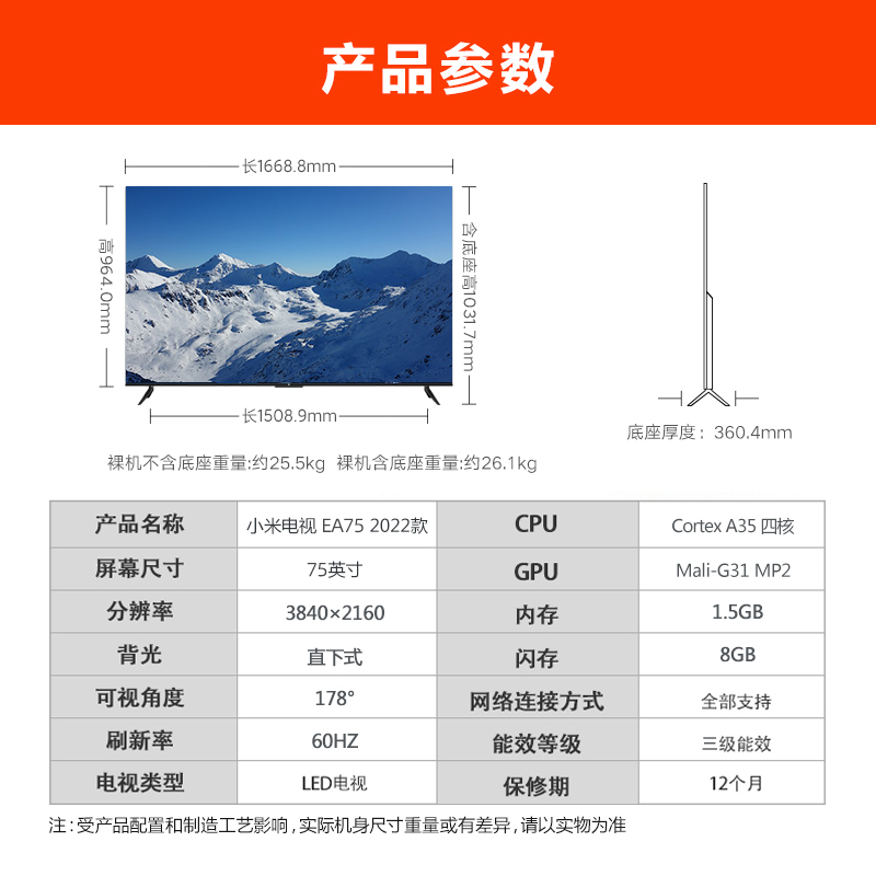 Xiaomi L75M7-EA 75 "2022 Metal Full Screen Smart wifi Voice Flat Panel TV 82