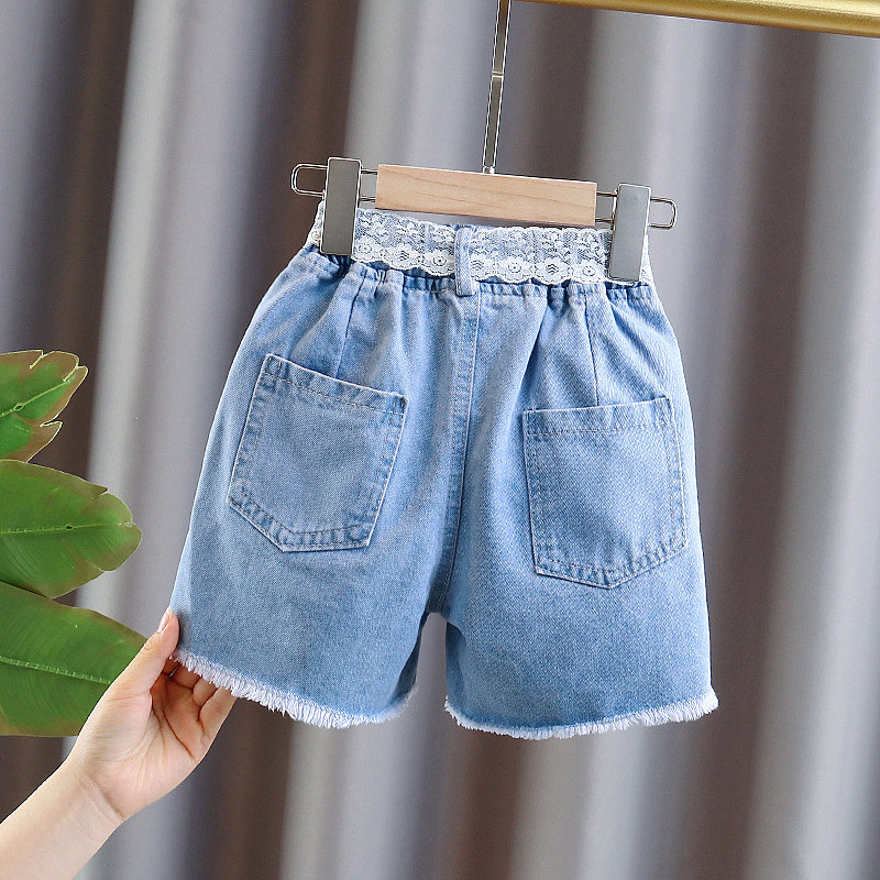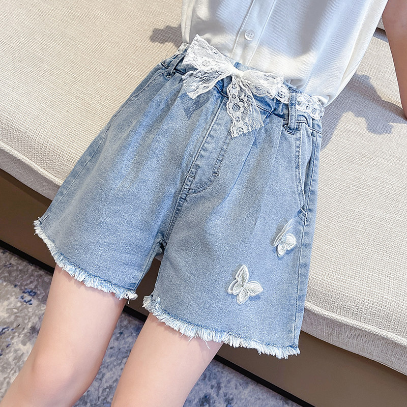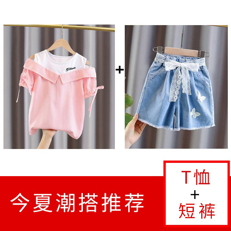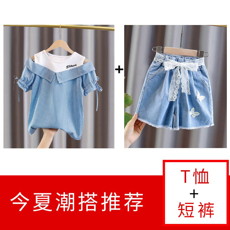 Blue (if you are not fat, choose one size larger according to your height) Blue striped off-the-shoulder T children's voice butterfly denim shorts (shorts are one size smaller) Pink striped off-shoulder T children's voice butterfly denim shorts (