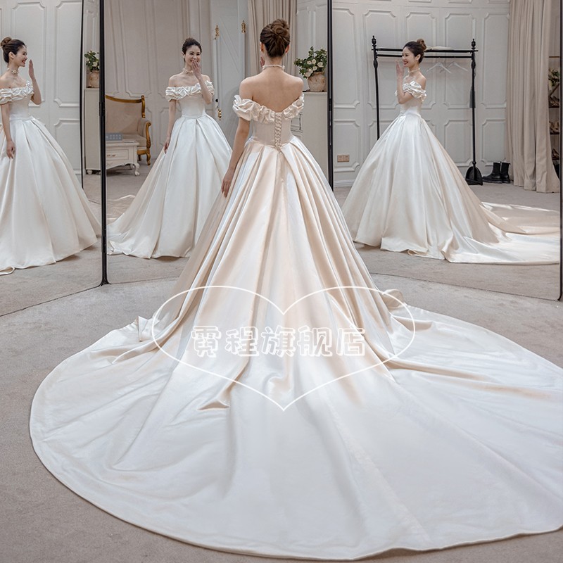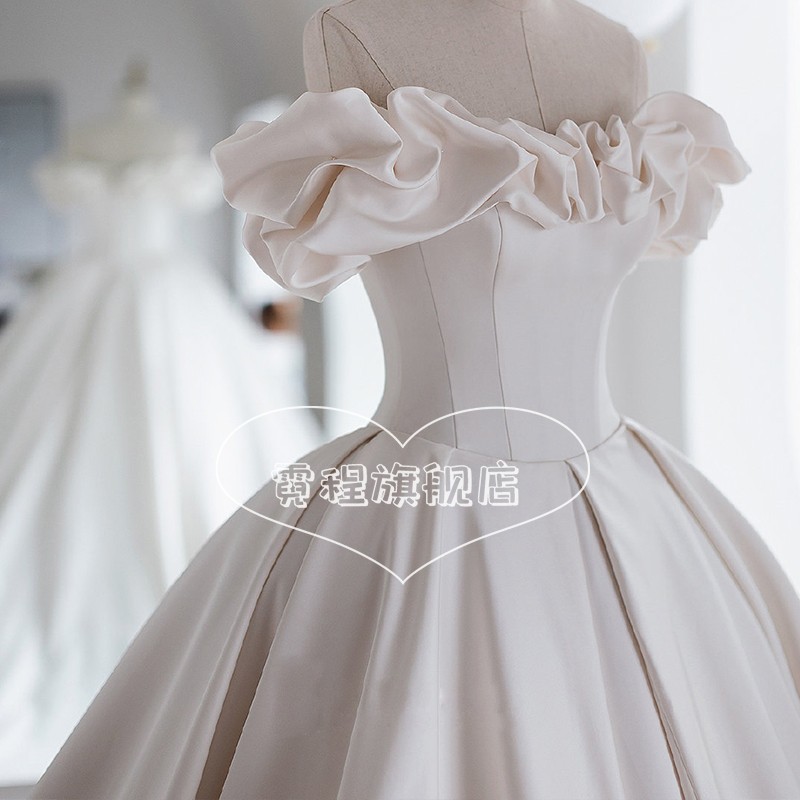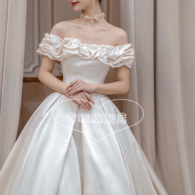 Satin light main wedding dress 2022 new style small girl bride French retro simple go-out yarn one-shoulder
