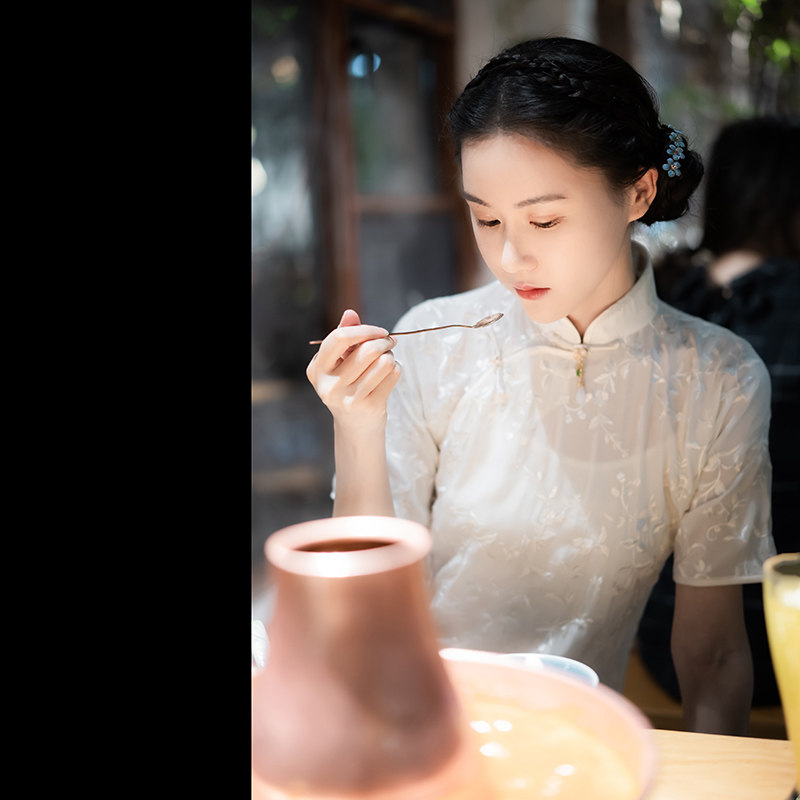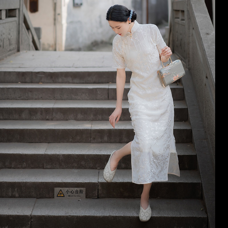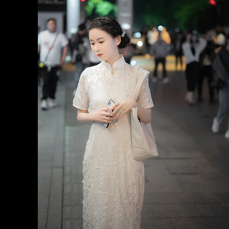 Xiaogongzi) Bairuiji) Republic of China style retro full cardigan button temperament embroidered raglan sleeve cheongsam dress