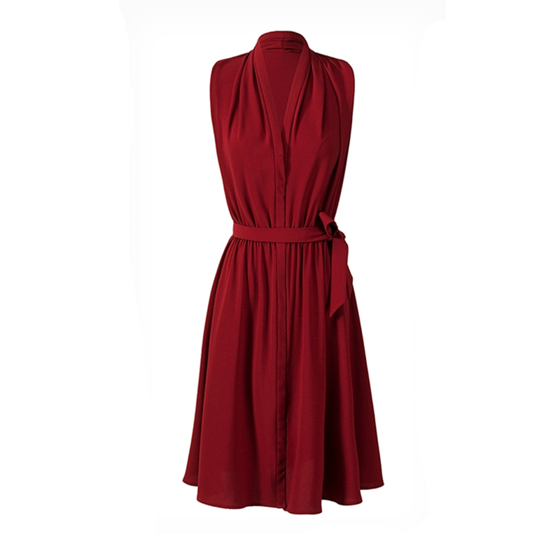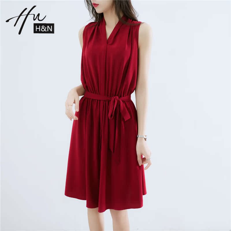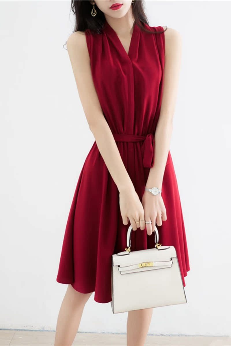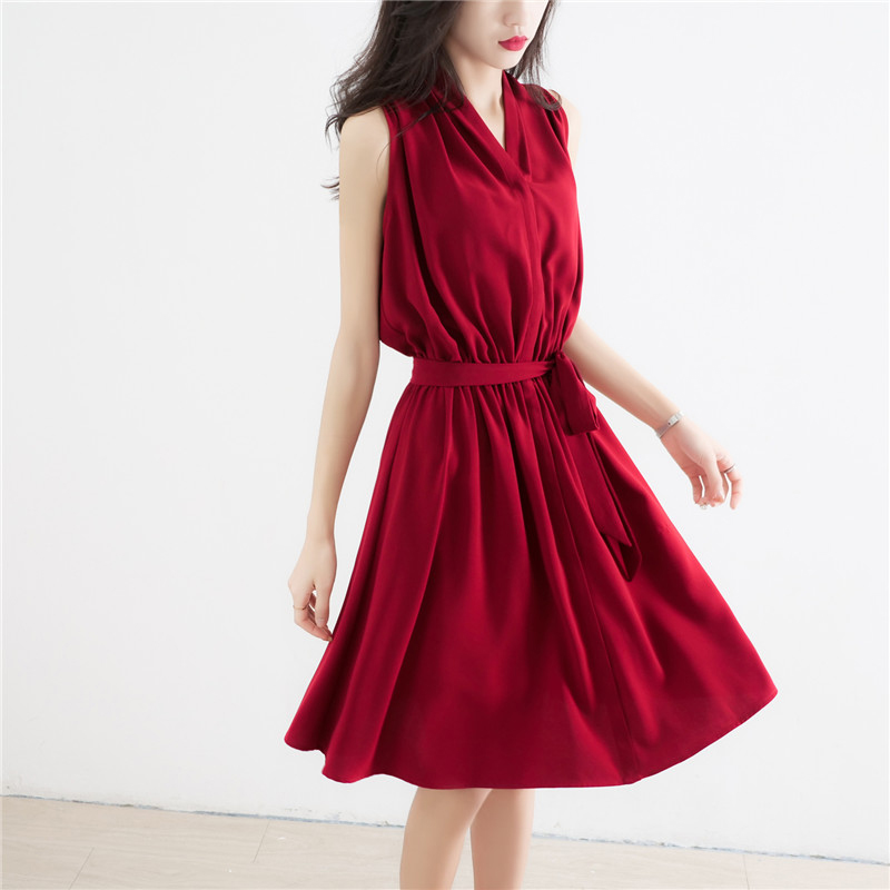 High-end French style foreign dress thin section small sublacing to collect waist display slim red temperament with white vest skirt female summer tide