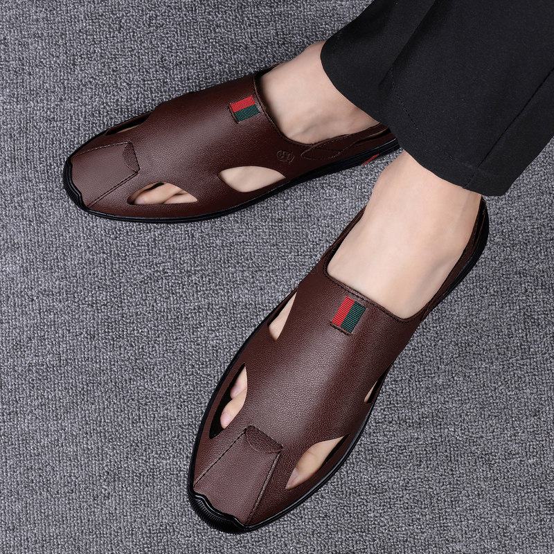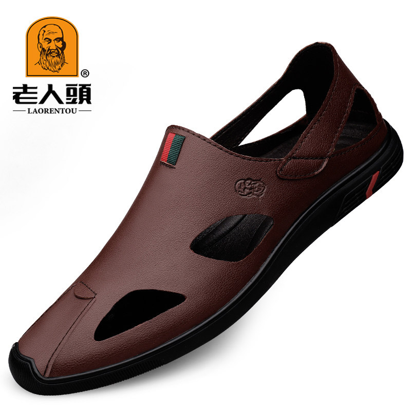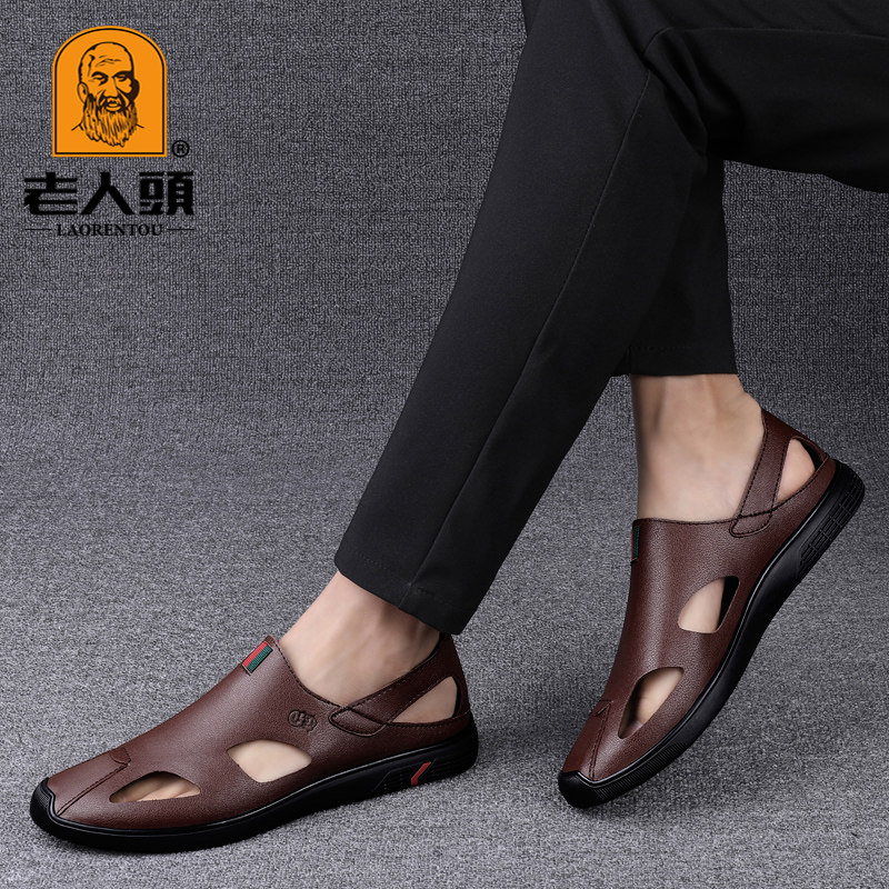 Old man's head sandals men's leather soft bottom Baotou Bull Leather Beach Cave Shoes Hollowed-out Waterproof Outwear Driving Sandal Sandals Shoes