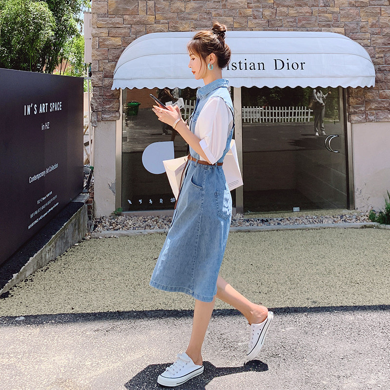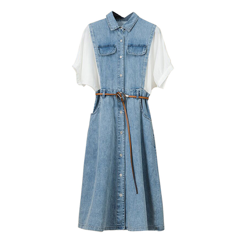 Denim stitching dress women's summer thin section small waist slimming French retro age-reducing a-line shirt dress