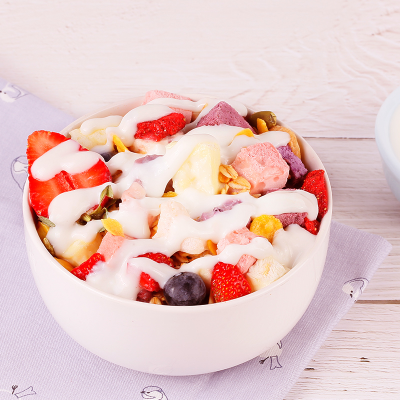 Baked oatmeal cornflakes red dried banana slices pumpkin kernels coconut flakes freeze-dried strawberry blueberry yogurt block yellow peach yogurt block white sesame seeds