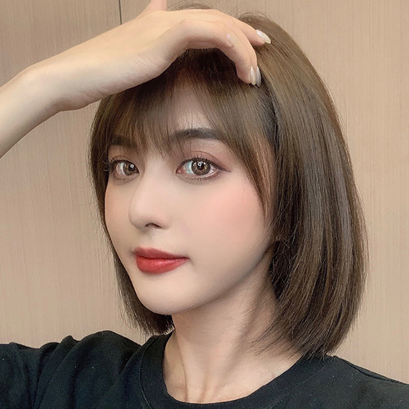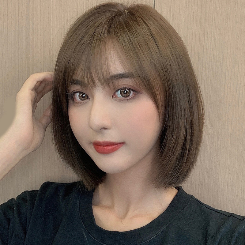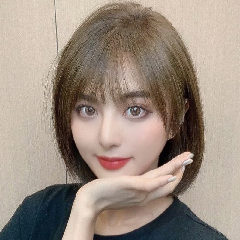 Wig female short hair round face bob head real hair fashion natural air bangs full head cover wig set